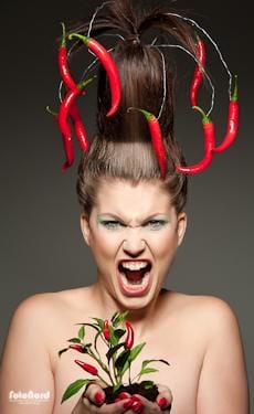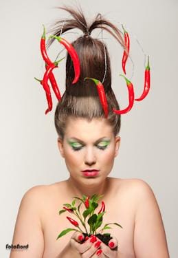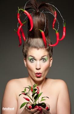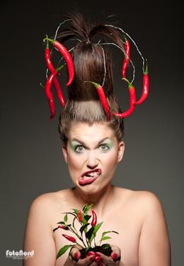 Några fler bilder från chili-sessionen. Jag ska kanske tillägga att det inte är nåt photoshoppat spektakel på huvudet. Flera trodde att “korv med bröd sessionen” med Pia var fusk, att det var en hatt. Hell no! Hårstylingen är helt och hållet gjord av Maria, med hjälp av flätor, skumgummi och ståltråd m.m. Jag har inte hjälpt till något alls med håret i efterhand.