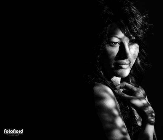 Här är några bilder som jag och Emelie gjorde i veckan. Jag brukar inte titta på Top model så mycket, men ett par avsnitt har jag sett, och i ett av dem gjorde Tyra Banks en plåtning med ljussättning genom olika tyger som jag blev inspirerad av. Tanken är att ljussätta en människa genom en struktur eller ett tyg och skapa olika ljus- och skuggmönster i ansiktet eller på kroppen. Efter att ha varit runt och kikat i lite affärer och secondhandbutiker hittade jag en virkad duk samt en spetsgardin med lagom stora hål. Den här sessionen får ses som en övning inför sommaren då jag tror att den här grejen blir både enklare och bättre utomhus i naturligt ljus. I det här fallet var det dock studion som användes och jag sköt blixtljuset genom en smal snoot med raster för att få ett väldigt riktat ljus med hård karaktär. Jag började med att prova en massa olika lösningar med fastljus och tejpade softboxar men blev inte nöjd alls. Som tur var hade Emelie stort tålamod med att stå och vänta medans jag meckade ljus. Jag var nästan på väg att ge upp då jag provade snooten på ett bra avstånd och till slut fick till den ljuskaraktär jag var ute efter. Nu är det bara att vänta in sommaren och göra ett nytt försök i en schysst utemiljö.