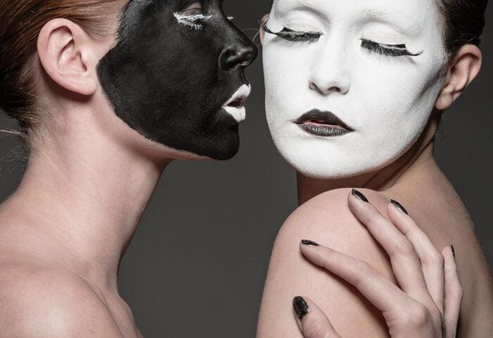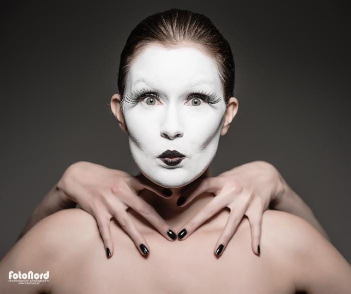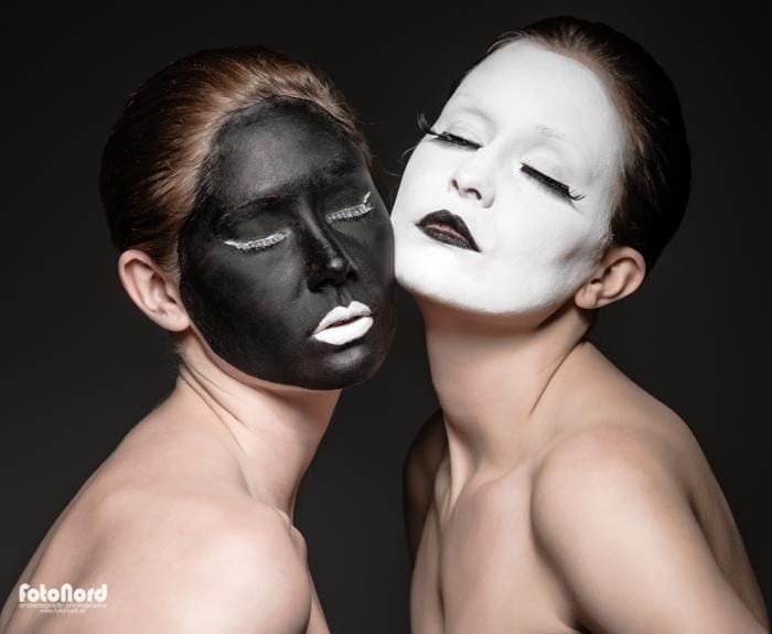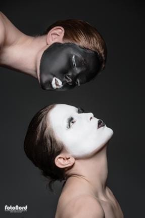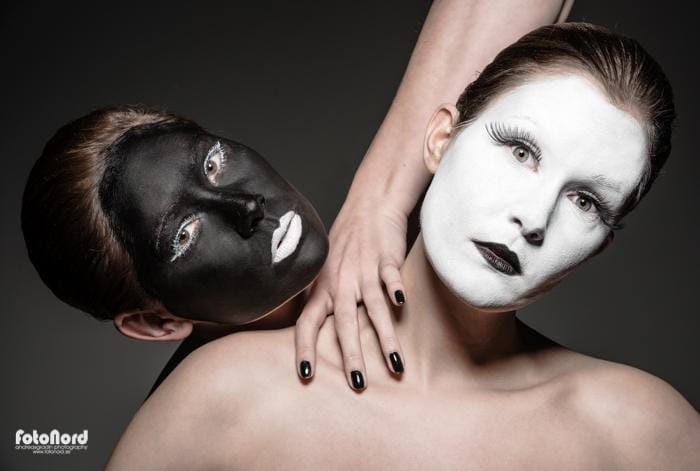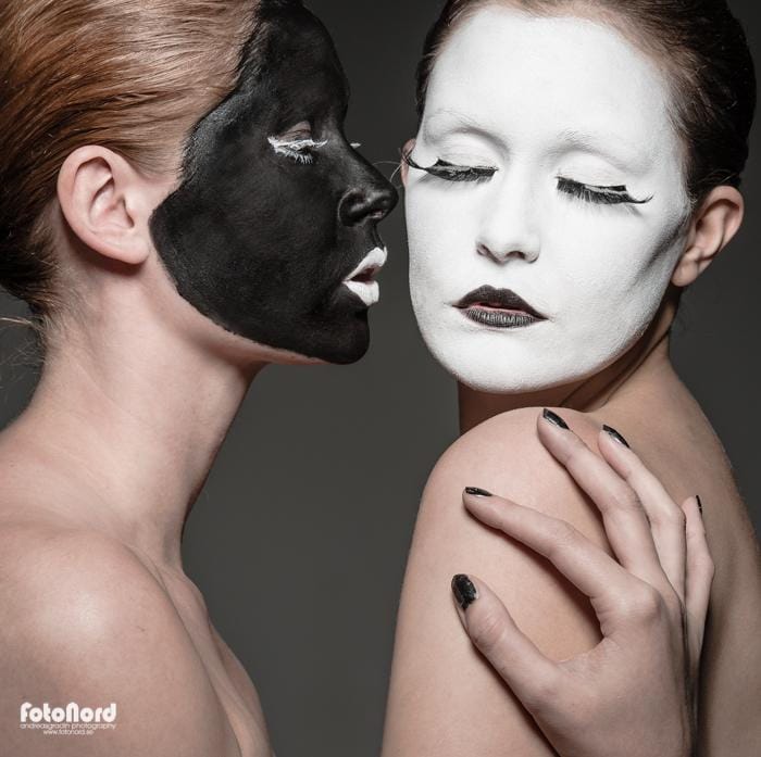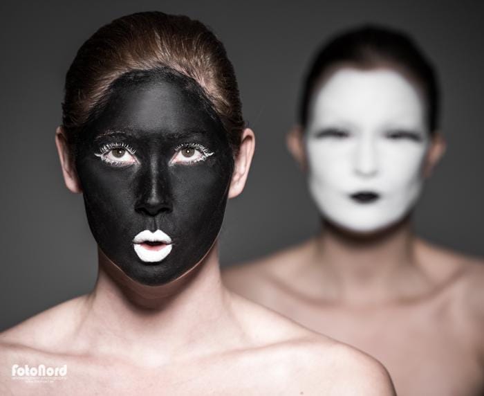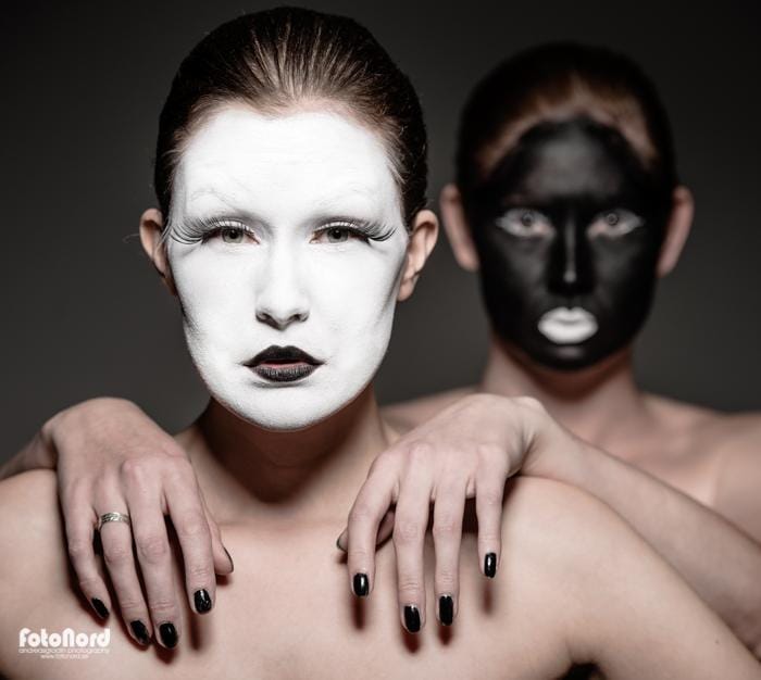 November 10, 2012Jag hade en ide om att göra någon slags yin/yang/kabuki-inspirerad session med två karaktärer, en vit och en svart. Något slags motsatsförhållande på bild helt enkelt. Carolina och Elin nappade på iden och efter att ha gått lös på teatersminklådan och limmat lösfransar var det dags att agera framför kameran. Jag insåg ganska snabbt att det inte skulle bli så enkelt som jag hade trott att ljussätta komponera bilderna så som jag hade dem i mitt huvud. Det svarta och vita sminket hade helt olika karaktär i blixtljuset så det blev till att kompromissa och välja ett ljus som funkade på båda ansiktena. Jag använde endast en silverfärgad beautydish rakt framifrån med och utan bikakeraster. I min ursprungside var alla dessa bilder svart/vita, men så blev det inte alls efter några testredigeringar. Utan hudton tappade de massor med dynamik. Carolina och Elin gjorde en kanoninsats med kreativa förslag på posering och uttryck, men nåt annat hade jag ju inte väntat mig heller. 🙂