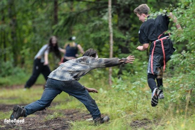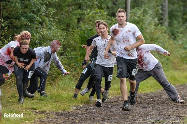 När tävlingen körde igång gjorde jag mitt bästa för att hinna med så många platser som möjligt. Jag ville framförallt ut i skogen och fota då jag misstänkte att publikplatserna i centrala Sävar skulle fotograferas ganska mycket av publiken. Det blev ett rejält träningspass kan jag lova. Två kamerahus med bland annat 300mm/2.8 på samt kameraväska m.m. var ingen lek att löpa runt med. I slutet av tävlingen sprang jag bokstavligen mellan stationerna. Men det var det värt. Jag fick kanonbilder mest hela tiden av såväl zombies som löparna som var strax under 300 till antalet. Det är faktiskt ganska roligt att se hur bilderna på löparna skiljer sig åt från bilder från vanliga löpartävlingar. Då kan folk se ganska sammanbitna och plågade ut. Här hade i princip alla löpare ett stort flin i ansiktet på varenda bild. Folk hade verkligen skitkul. Zombierna gjorde ett kanonjobb och vissa gick helt upp i sina roller och skrämde vettet ur såväl löpare, publik som fotograf..hmmm 🙂