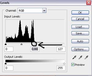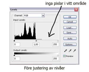 Detta kan man även se när man öppnar verktyget "nivåer". I histogrammet, det grafiska diagrammet över bilden ser man tydligt att det helt saknas information i den delen av histogrammet. Längst till vänster i diagrammet är den mörka delen av bilden och längst till höger den ljusa. På de ställen där kurvan är hög finns det många pixlar i bilden.
