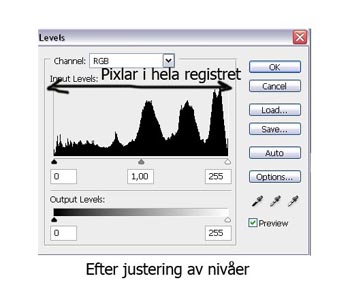 Tittar man på histogrammet efter justeringen ser man också att bilden numera innehåller information i hela registret. Så gott som alla bilder kan justeras i "nivåer".